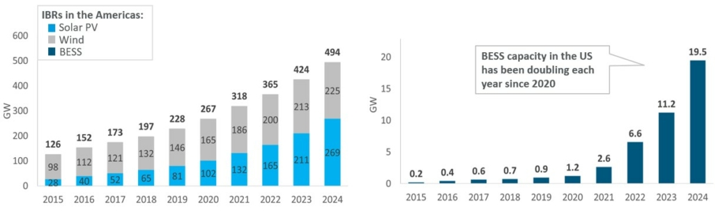 Across the Americas – from Canada in the north to Chile in the south – solar energy capacity increased ninefold and wind capacity doubled between 2015 and 2024. In the United States, battery energy storage systems have (BESS) been doubling in capacity each year since 2020. While these gains are largely positive for affordability and emissions, inverter-based resources (IBRs), such as solar and wind, are intermittent and non-dispatchable, and do not provide the inertial frequency support that spinning turbines in conventional power plants offer. This raises concerns about dependable capacity during high-stress periods on the grid.